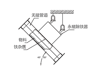 適合沒有輸送皮帶,只能提供下料溜槽的場合。當散狀物料經過時,鐵雜物被高磁場的永磁鐵吸附,清除鐵雜質時,打開管道專用門將雜質人工取除。該設備適用于含鐵量較少的場合,主要應用于水泥、化工、煤炭、塑料、耐火材料、建材等行業的下料管道中清除雜質。