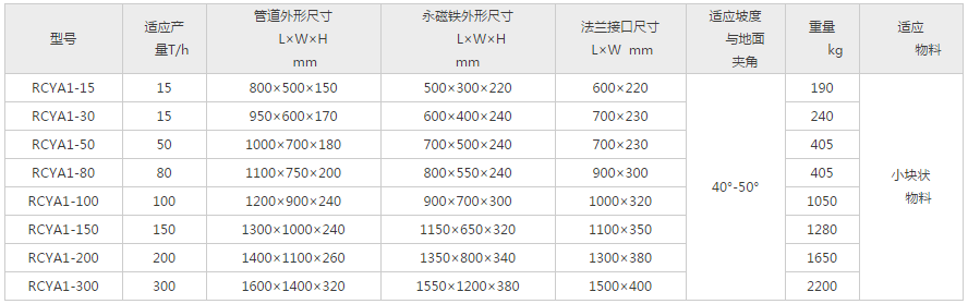RCYA型傾斜管道式永磁除鐵器分為RCYAl、RCYA2兩種,包括無磁管道和永磁鐵兩部分,專用于封閉管道內非磁性物料的除鐵,永磁除鐵器內部采用高性能稀土強磁材料組成復合磁系。具有體積小、磁力大、重量輕、除鐵干凈、方便、無能耗、使用壽命長等特點。