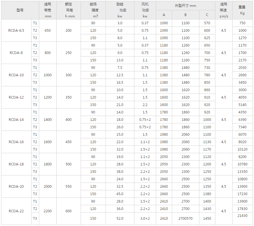 RCDA-T型超強風冷式電磁除鐵器內部磁路設計獨特,透磁深,吸力大,吸力遠大于國標除鐵器。軸流式風機強迫風冷,風量大,使除鐵器散熱快、溫升低,保障除鐵器無故障長期工作。