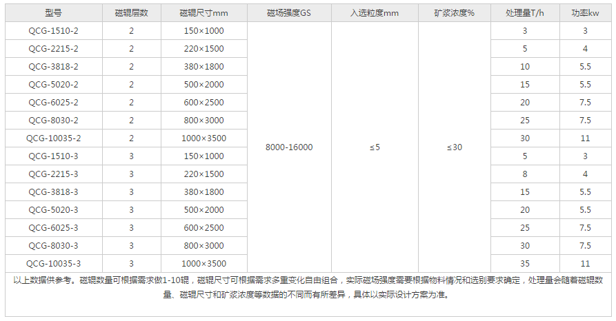 QCG型輥式磁選機是我公司根據多年經驗和客戶現場需求研發的一種組合機型,可以實現多重結構或不同磁場強度的組合。主要用于細粒弱磁性礦石的粗選、掃選和精選。可有效的對錳礦、赤鐵礦、假像赤鐵礦、鏡鐵礦、菱鐵礦、錳礦、鉻鐵礦針鐵礦、褐鐵礦、菱鐵礦、鉻鐵礦、鈮鉭鐵礦、鈦鈰鐵礦、黑鎢礦、鐵英巖礦、磷灰石、磷釔礦、橄欖石、硫銅鍺礦、鐵白石、黑云母、綠簾石、蛇紋石、原生鈦鐵礦,海濱砂礦,原生金紅石,黑鎢礦和非金屬除鐵。